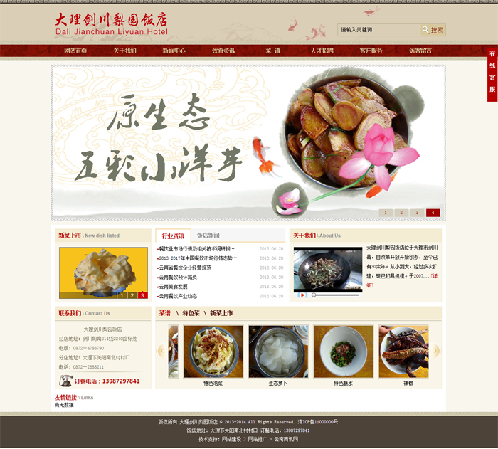 大理劍川梨園飯店位于大理市劍川縣,自改革開(kāi)放開(kāi)始創(chuàng)辦,至今已有30余年。從小到大,經(jīng)過(guò)多次擴(kuò)建,現(xiàn)已初具規(guī)模。于2007年在大理市下關(guān)開(kāi)設(shè)分店。本店主要以大理白族清燉、黃燜雞為主,土雞來(lái)源于劍川山區(qū)農(nóng)家放養(yǎng),在老人(趕馬幫)家傳烹調(diào)技術(shù)之上加以改進(jìn)完善。其次用劍川高山純天然綠色的紫洋芋(七彩洋芋)蘿卜,以獨(dú)特的白族農(nóng)家風(fēng)味精心制作出油炸七彩洋芋、清湯蘿卜,再次以大理劍川自己種植的獨(dú)特的大辣椒為主料制作的油炸辣椒,別具風(fēng)格,辣中帶甜?;旌弦员镜靥禺a(chǎn)蓮花白和紅辣椒根據(jù)傳統(tǒng)的制作方法制作的泡菜。將各自的營(yíng)養(yǎng)價(jià)值和特色,完美的搭配到一起。真正做到地道的大理白族農(nóng)家風(fēng)味。已得到消費(fèi)者的一致贊同。