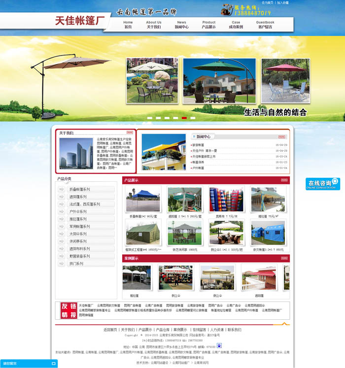 云南索樂商貿(mào)帳篷生產(chǎn)定做昆明帳篷,云南帳篷,云南昆明帳篷廠,云南昆明戶外帳篷,昆明戶外帳篷,云南昆明折疊帳篷,昆明折疊帳篷,云南昆明救災(zāi)帳篷,昆明救災(zāi)帳篷,昆明廣告帳篷,云南廣告帳篷,昆明旅游帳篷,云南旅游帳篷,昆明廣告?zhèn)?,云南廣告?zhèn)?,云南昆明遮陽傘等帳篷的專業(yè)生產(chǎn)廠家;云南索樂商貿(mào)有限公司旗下的天佳帳篷廠是一家集開發(fā)設(shè)計(jì)、生產(chǎn)、銷售戶外遮陽帳篷、活動(dòng)折疊篷、廣告帳篷、遮陽布料的專業(yè)生產(chǎn)廠家。 經(jīng)過多年的努力開拓、拼搏,本廠已擁有完備的生產(chǎn)設(shè)施和場地,有健全的組織機(jī)構(gòu)和雄厚的技術(shù)力量,有完善的生產(chǎn)管理和銷售服務(wù)系統(tǒng).產(chǎn)品銷售首先以云南為中心,逐步向全國輻射,良好的口碑使我們的帳篷很快就成為國內(nèi)外眾多知名品牌、企事業(yè)單位宣傳、促銷、廣告、慶典、休閑活動(dòng)必備器材的首選!廣泛應(yīng)用于展覽會(huì)、游樂園、別墅區(qū)、各類高檔賓館、餐廳、酒吧、咖啡廳、公寓,休閑度假旅游區(qū),休閑廣場,游泳池,海濱浴場,美食街,幼兒園,學(xué)校等戶外臨時(shí)活動(dòng)以及酒店、公寓樓的陽臺、露臺、陽光屋等休閑場所。