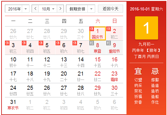 根據(jù)《國(guó)務(wù)院辦公廳關(guān)于2016年國(guó)慶節(jié)放假安排的通知》,現(xiàn)將2016年國(guó)慶節(jié)放假日期安排通知如下:根據(jù)最新放假安排,2016年我國(guó)國(guó)慶節(jié)從10月1日開(kāi)始至7日放假調(diào)休,共7天。10月8日(星期六)上班。 放假期間公司將無(wú)人值守,機(jī)房將24小時(shí)值班,請(qǐng)廣大客…