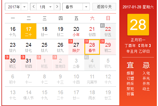 2017年1月1日(星期日)為國(guó)家法定節(jié)假日。2017年1月2日補(bǔ)休。2016年12月31日(星期六)、2017年1月1日、1月2日成三天假期。