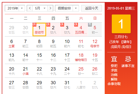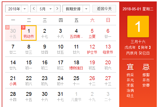 根據(jù)《國(guó)務(wù)院辦公廳關(guān)于2018年勞動(dòng)節(jié)放假安排的通知》,現(xiàn)將2018年勞動(dòng)節(jié)放假日期安排通知如下: 4月29日(星期天)至5月1日(勞動(dòng)節(jié),星期二)放假調(diào)休,共3天。 4月28日(星期六)上班。2018年4月29日(星期天)、4月30日(星期一)、5月1日(星期…