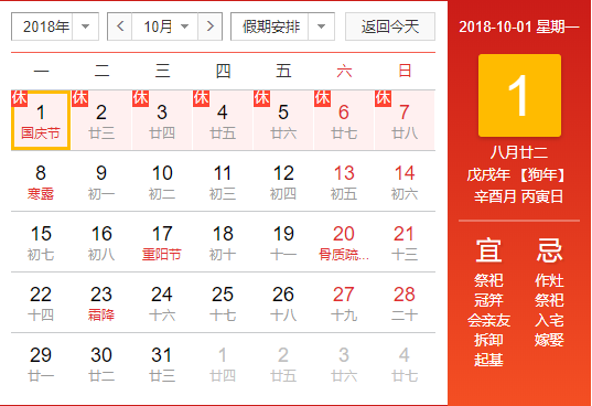 根據(jù)《國(guó)務(wù)院辦公廳關(guān)于2018年國(guó)慶節(jié)放假安排的通知》,現(xiàn)將2018年國(guó)慶節(jié)放假日期安排通知如下:根據(jù)最新放假安排,2018年我國(guó)國(guó)慶節(jié)從10月1日開(kāi)始至7日放假調(diào)休,共7天。9月29、30日(星期六、日)上班。放假期間公司將無(wú)人值守,機(jī)房將24小時(shí)值班,請(qǐng)…
