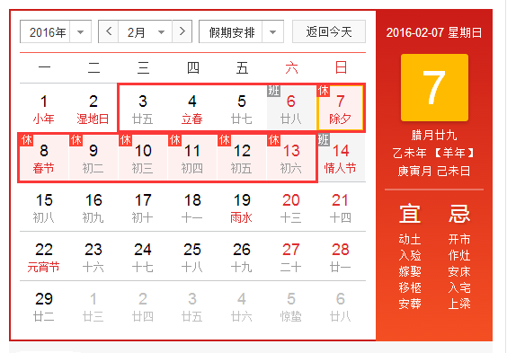 根據(jù)最新放假安排,2016年我國春節(jié)放假從2016年2月3日至2月13日調(diào)休,放假11天。2月14日收假上班。