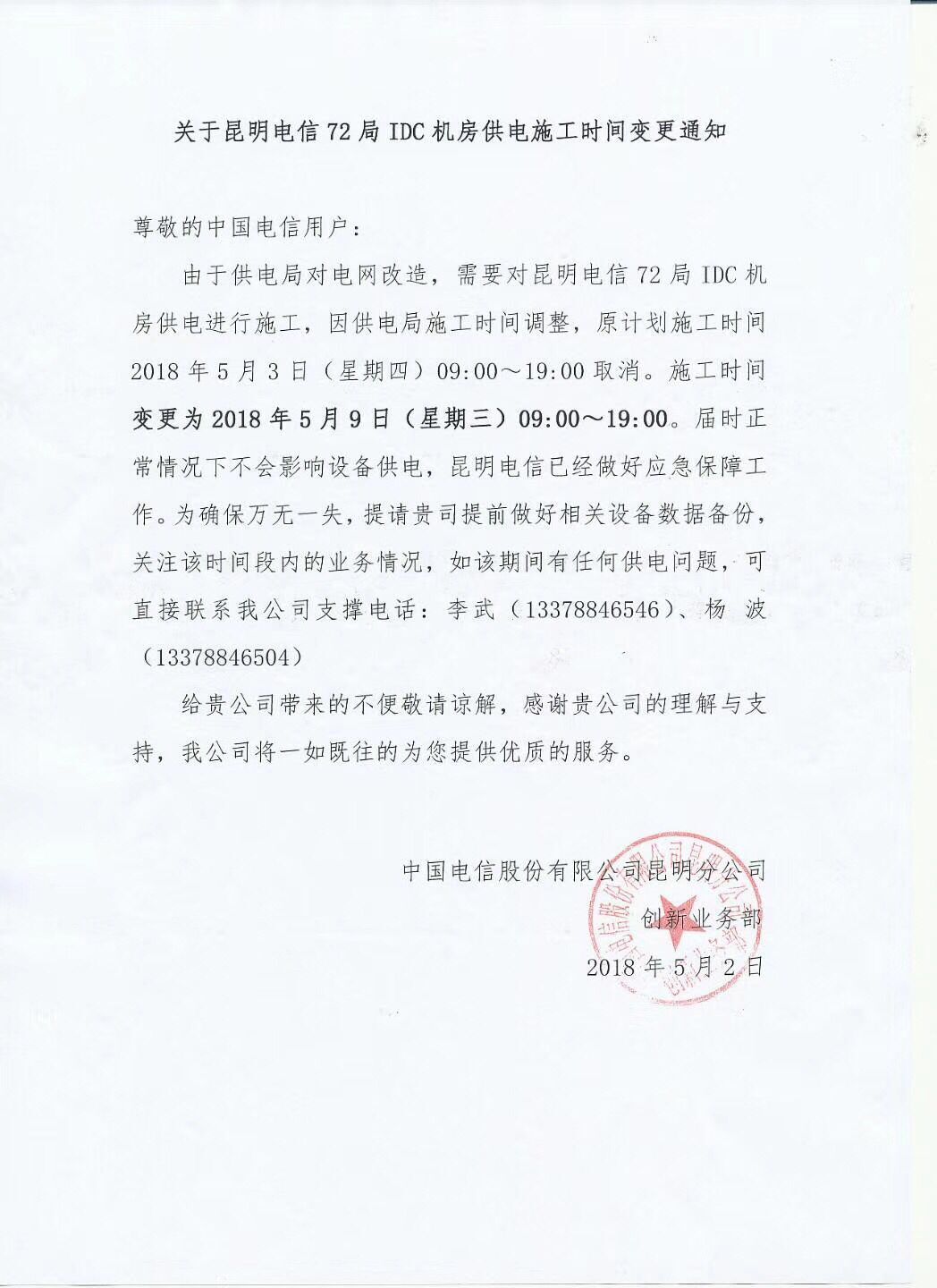 72電信機房供電施工通知