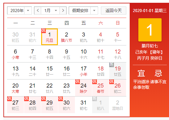 根據(jù)最新放假安排,2020年我國(guó)元旦節(jié)一天、2020年1月2日正常上班。