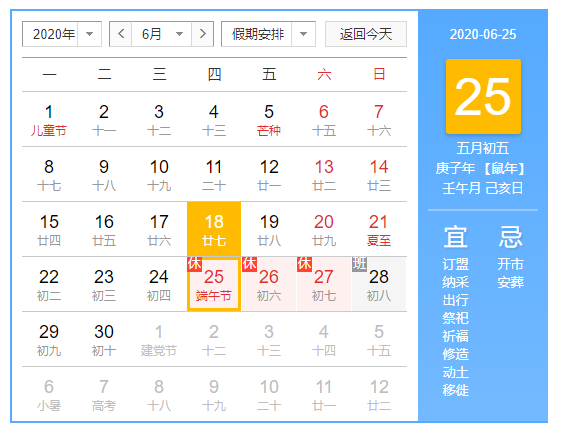 根據(jù)最新放假安排,2020年我國端午節(jié)從6月25日開始至6月28日放假共3天。6月29(星期日)上班。